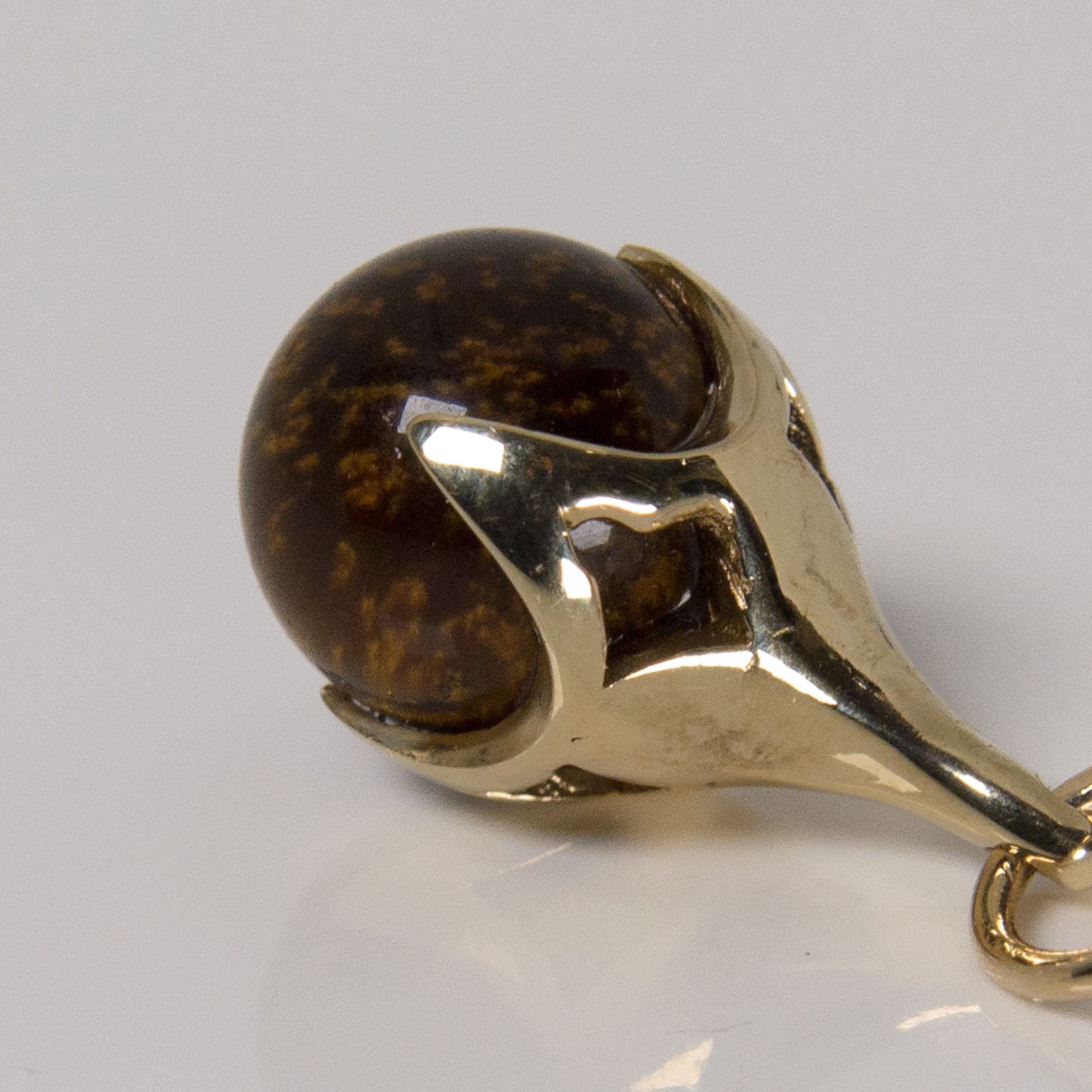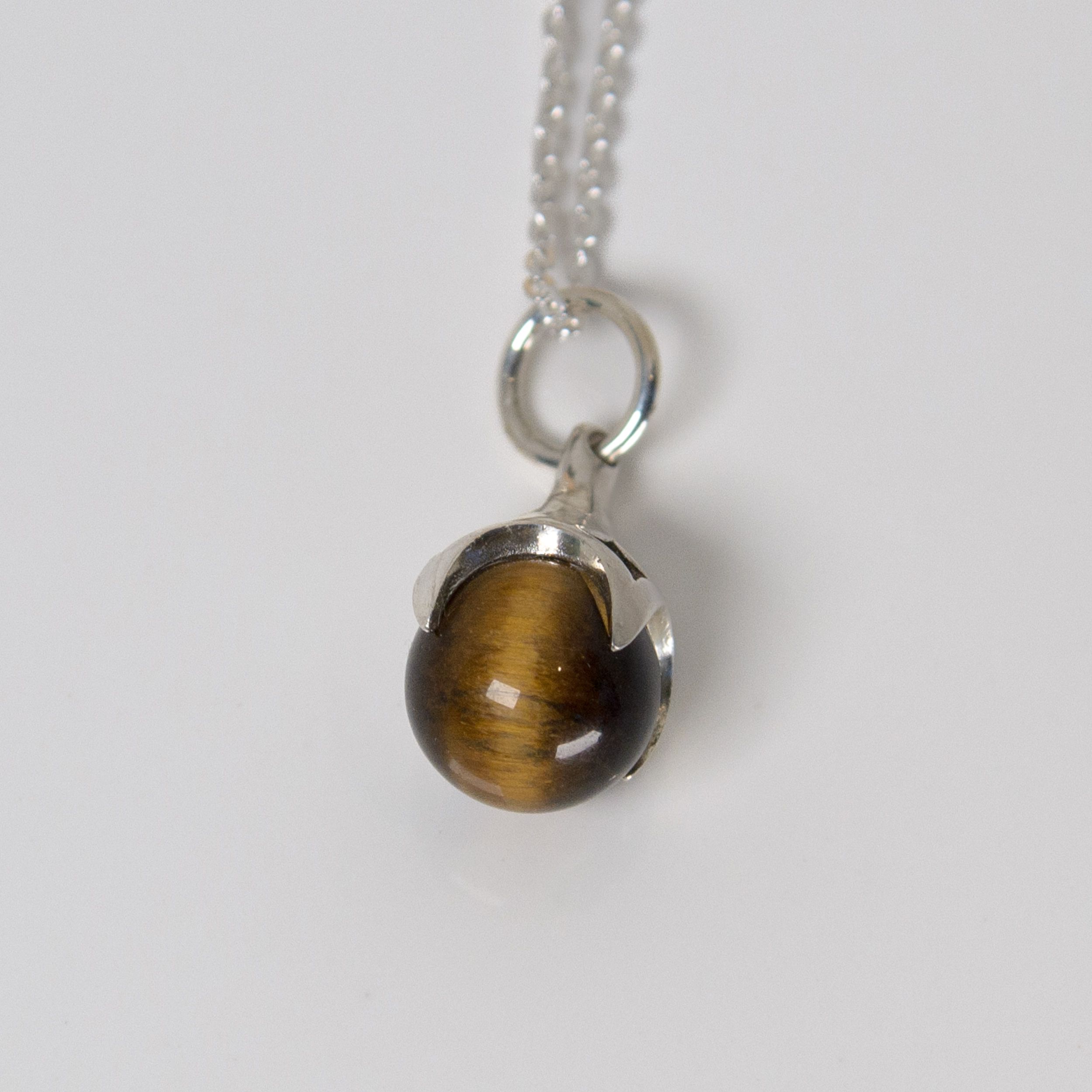 As if something has dropped down from the sky above to collect a tiny orb, the four claws of the pendant hold, but also flaunt, it’s previous bounty. A beautiful pendant mimicking a bird’s claw clutching a Tigers Eye gemstone bead.