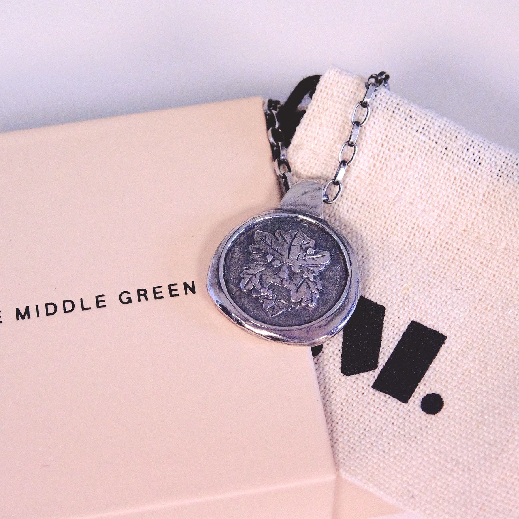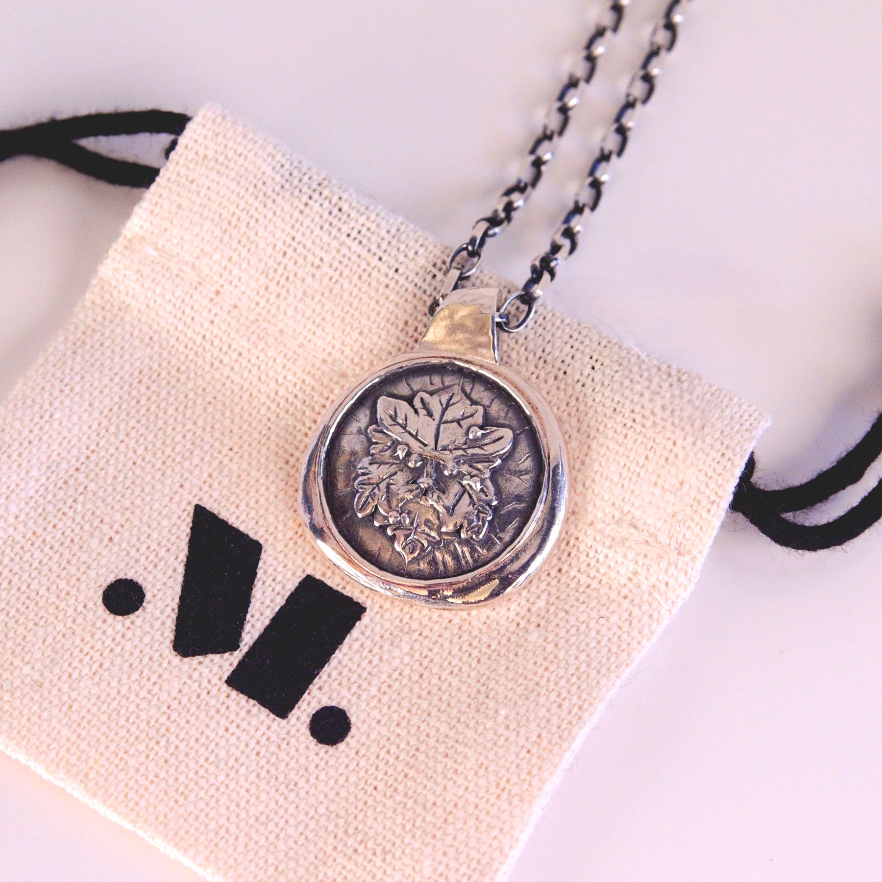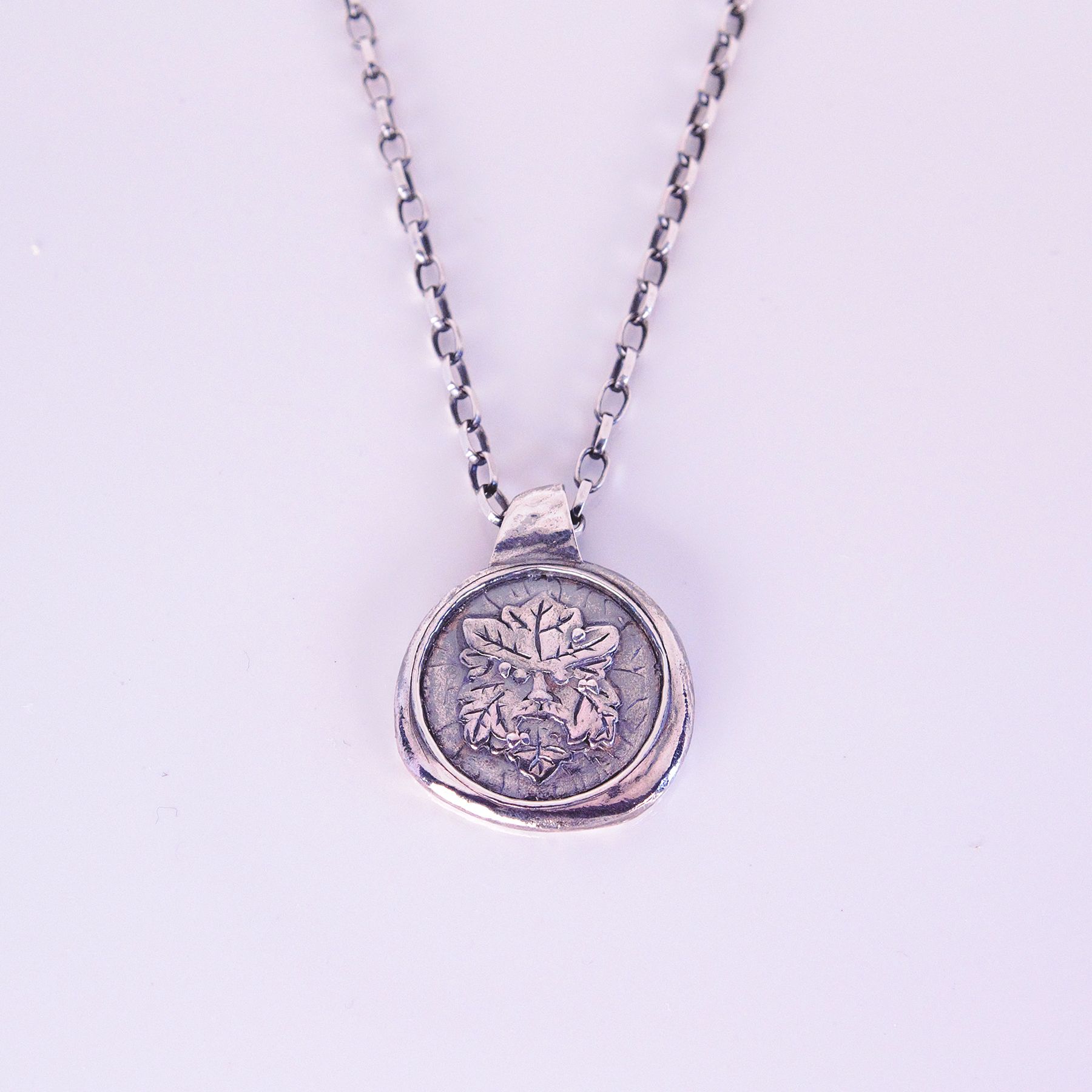 Carry the spirit of the forest with you. This handcrafted sterling silver pendant features the legendary Green Man – an ancient European symbol of fertility, renewal and the ever-turning cycle of Nature. Encircled by a softly organic border and suspended on a 20-inch chain, each piece is made in small batches in our studio, celebrating the natural textures and enduring beauty of silver. A talisman for growth, protection and connection to the world.