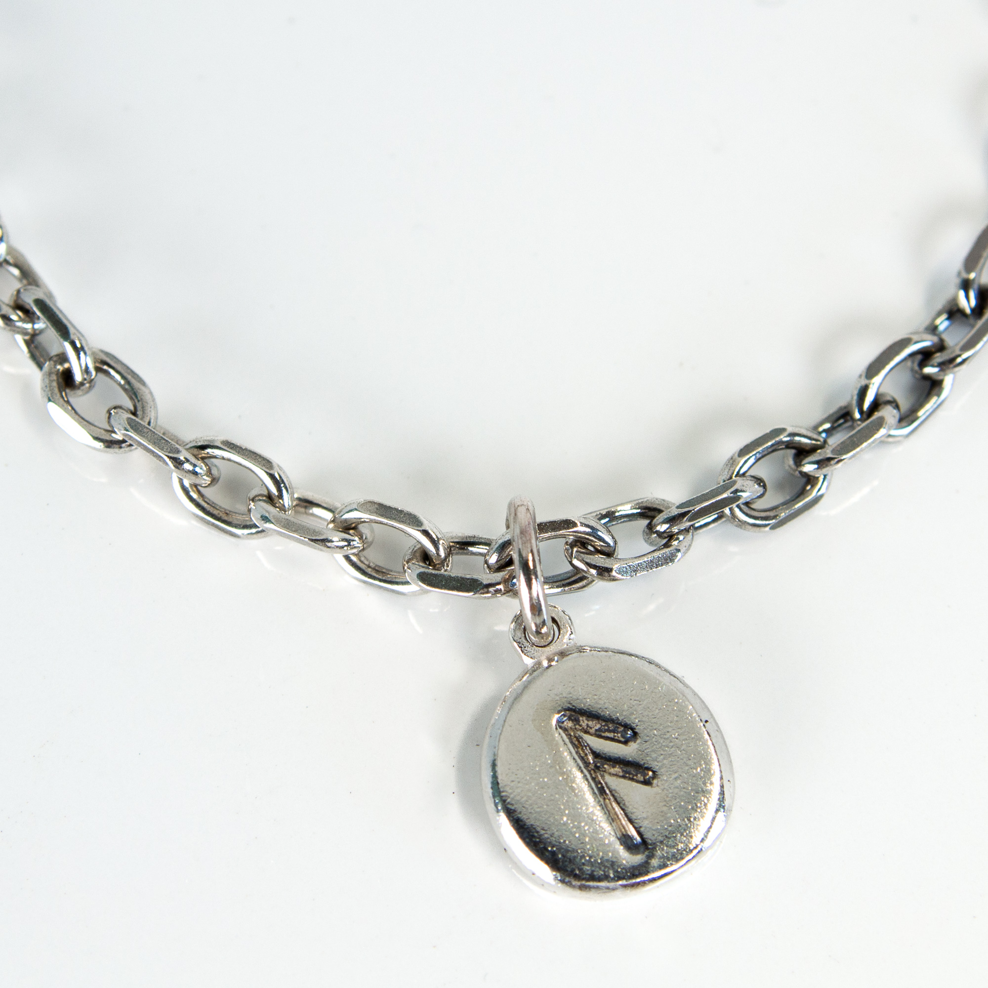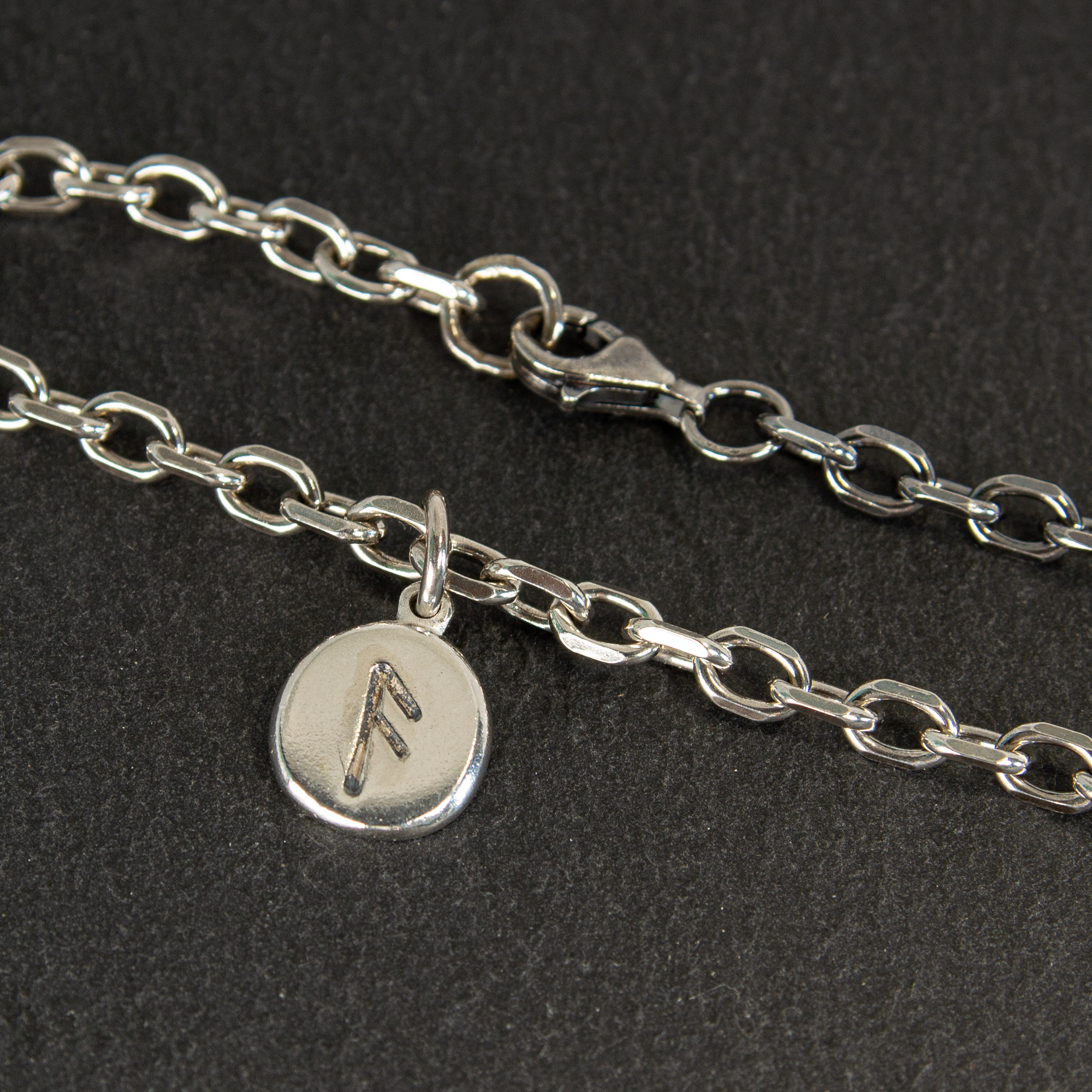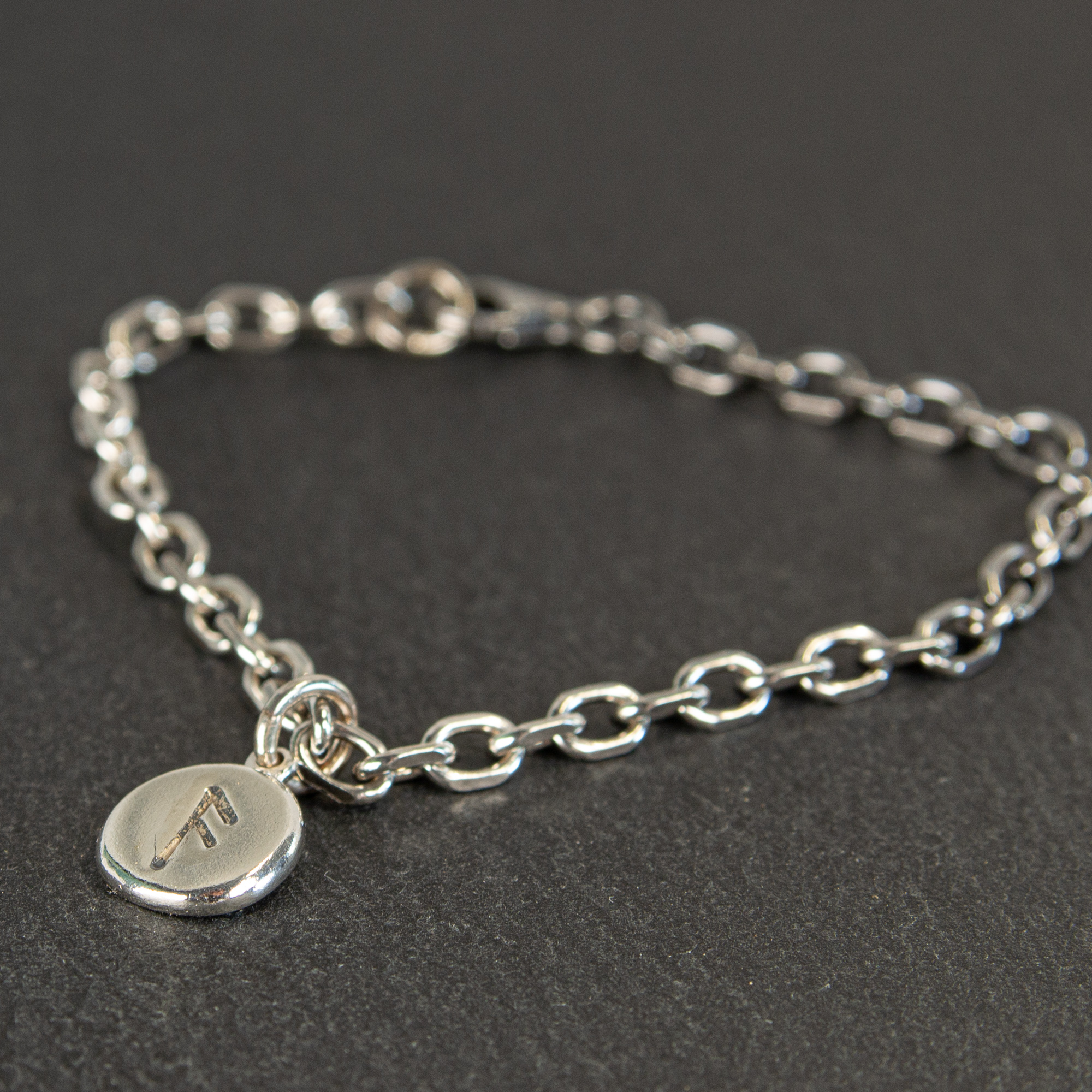 • Sterling silver Frum charm bracelet with engraved rune, designed as a small tactile talisman