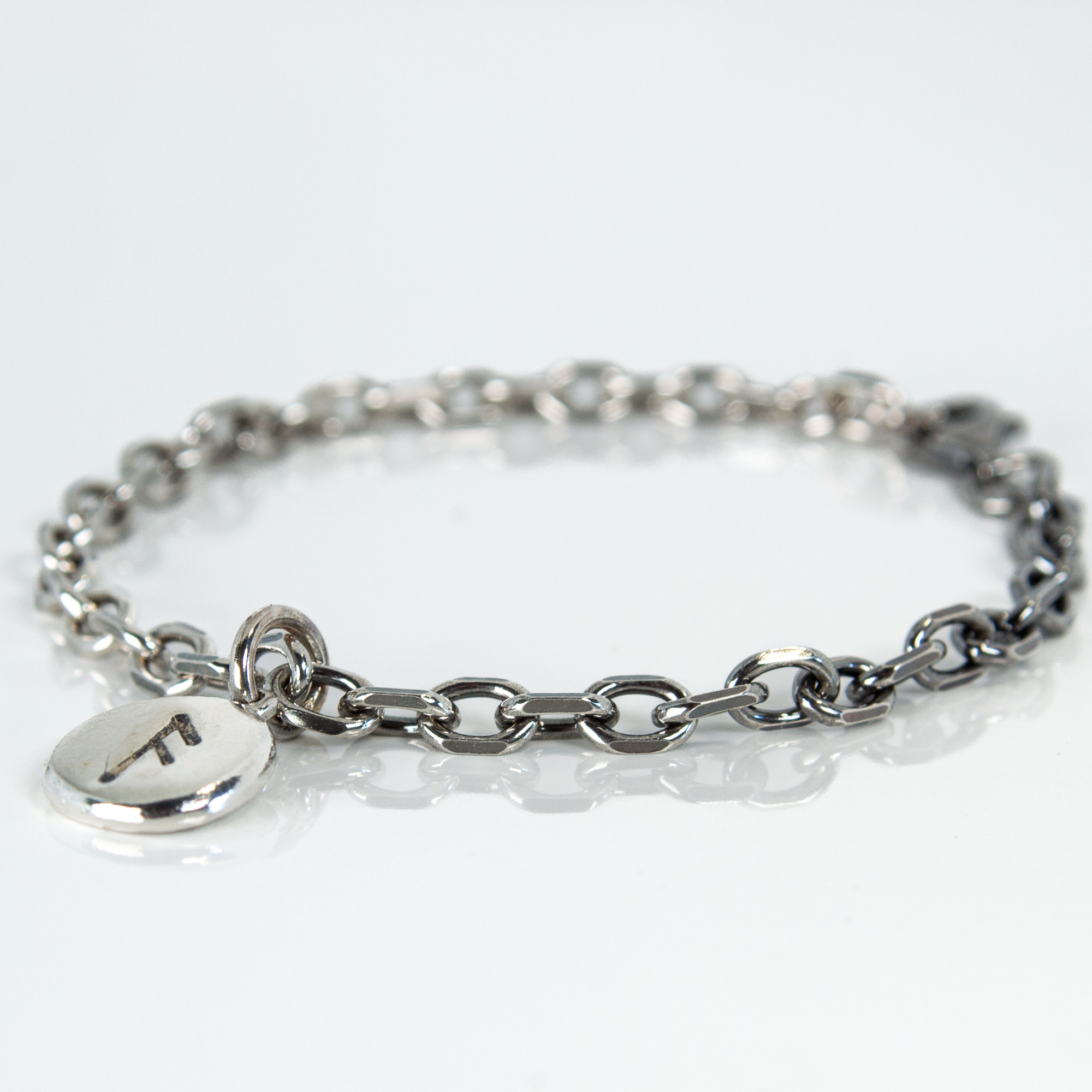 The charm is suspended from a sterling silver bracelet, creating a minimal piece that carries a clear point of meaning