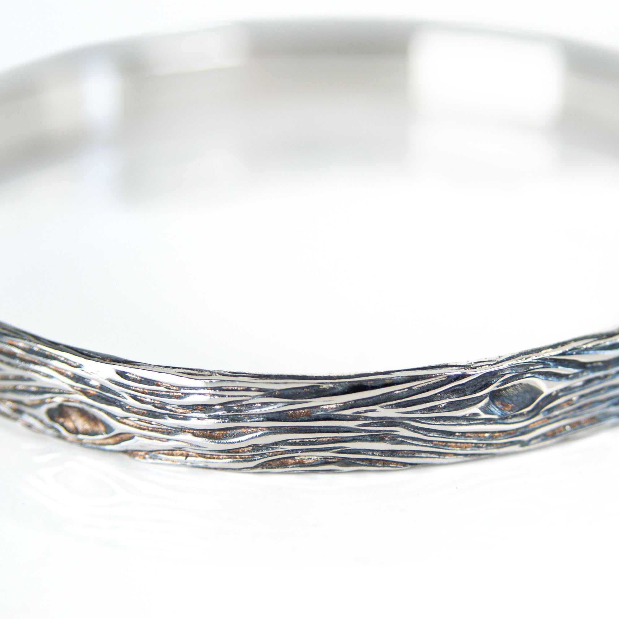 The surface is carved directly into the silver, creating a deeper and more pronounced wood grain texture than the slimmer version. No two pieces will ever be the same, with subtle variations reflecting the way real wood forms over time rather than being forced into uniformity