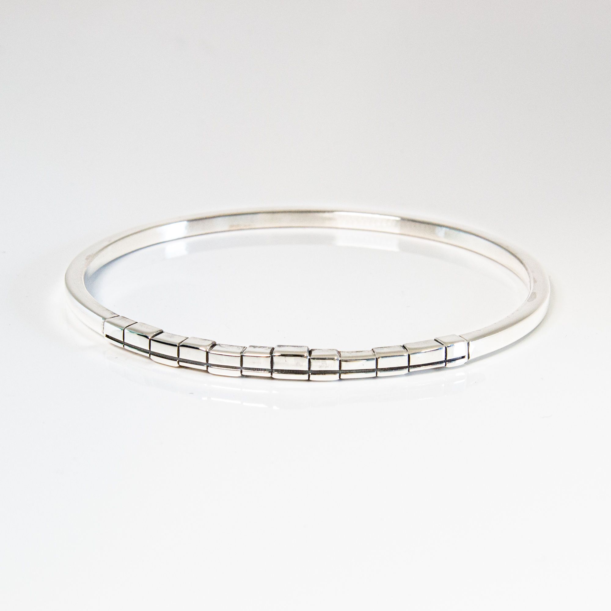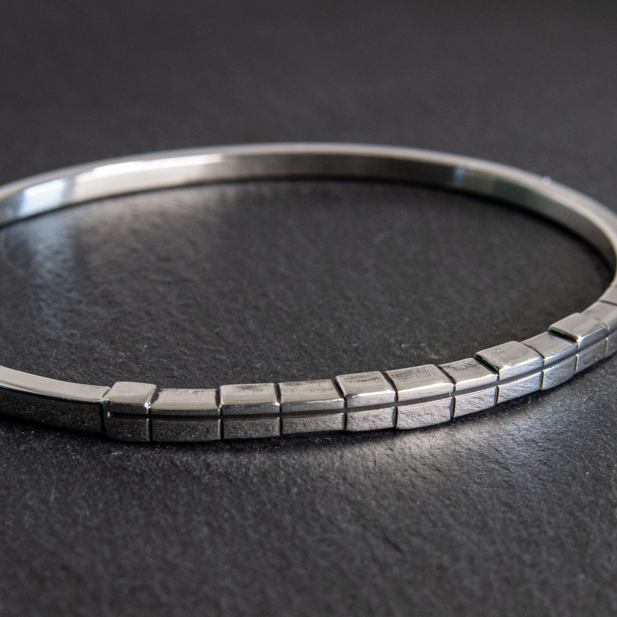 Inspired by solstice and equinox, Meridian is architectural rather than ornamental. Clean geometry. Deliberate repetition. A quiet rhythm carried at the wrist