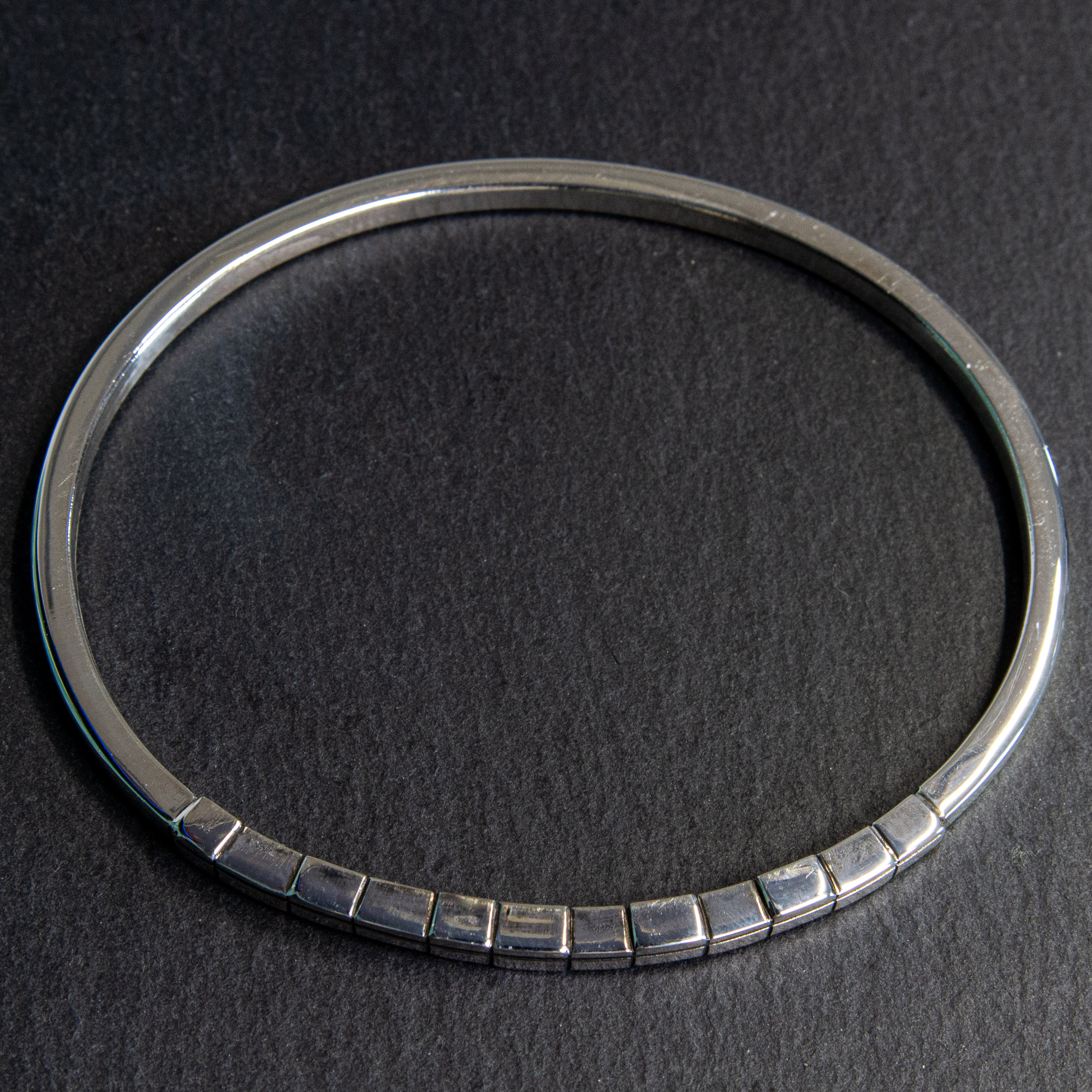 This is a solid, closed bangle. Segment selection refers to the 12 marked sections on the front arc