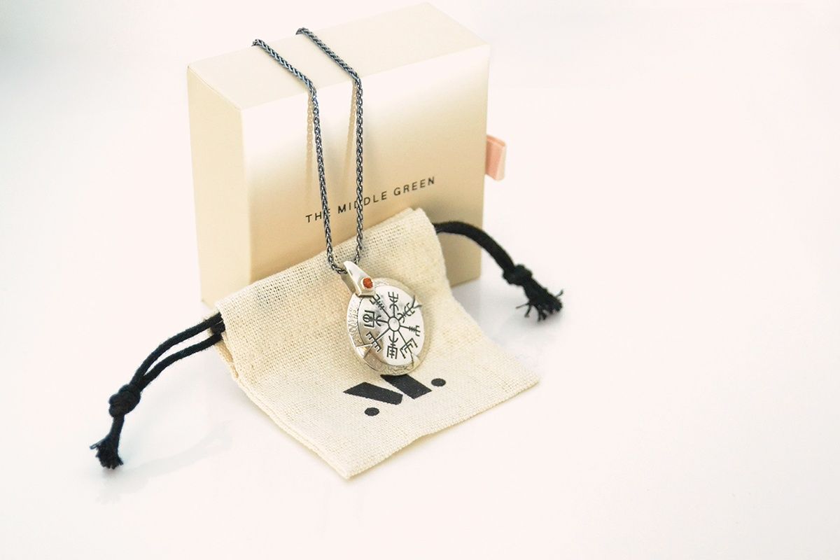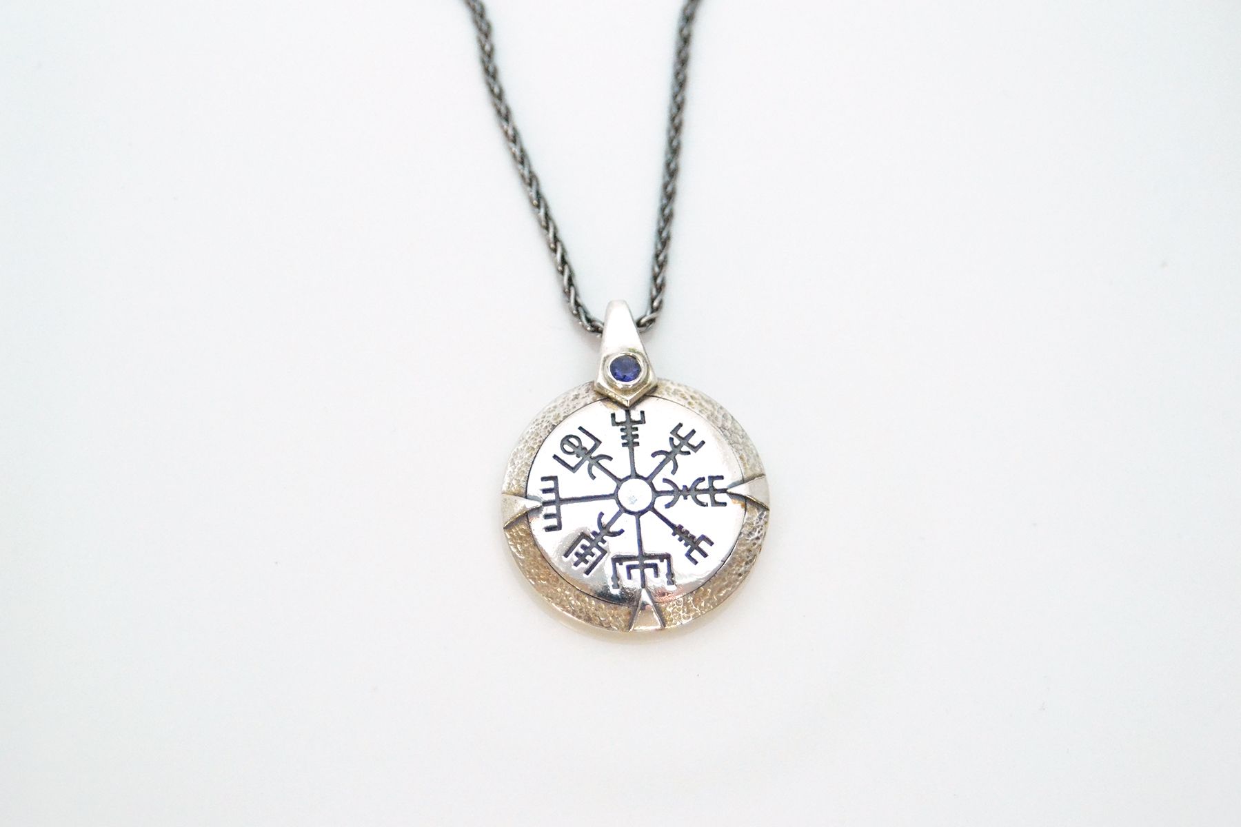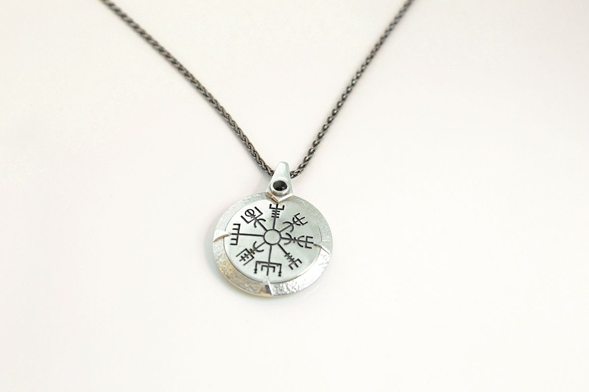 A gift for anyone travelling to distant shores, or starting a new adventure in life. The Vegvisir symbol is the Viking Compass and is intended to offer protection during rough weather and help the wearer find their way. Set either plain or with a gemstone of your choice. Made in sterling silver with a walnut inlay on the reverse. The pendant itself measures 25mm across.