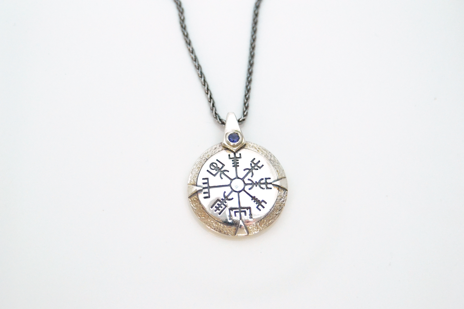 A gift for anyone travelling to distant shores, or starting a new adventure in life. The Vegvisir symbol is the Viking Compass and is intended to offer protection during rough weather and help the wearer find their way. Set either plain or with a gemstone of your choice. Made in sterling silver with a walnut inlay on the reverse. The pendant itself measures 25mm across.